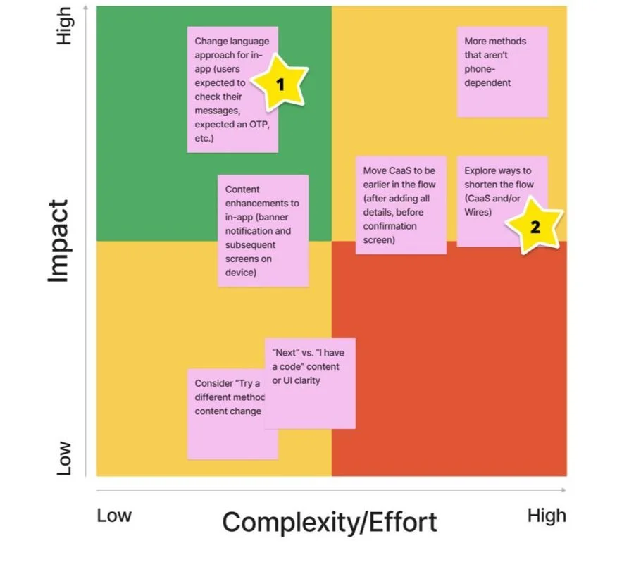 The researcher facilitating the sessions created a rapid report on the testing outcomes, and I took that (along with my notes) to map out some enhancements that could be worthy of our time to pursue. I plotted the enhancements on an impact vs. effort matrix to get a sense of what could be added to our roadmap to potentially lower drop-off rates, and I shared it with our stakeholders.